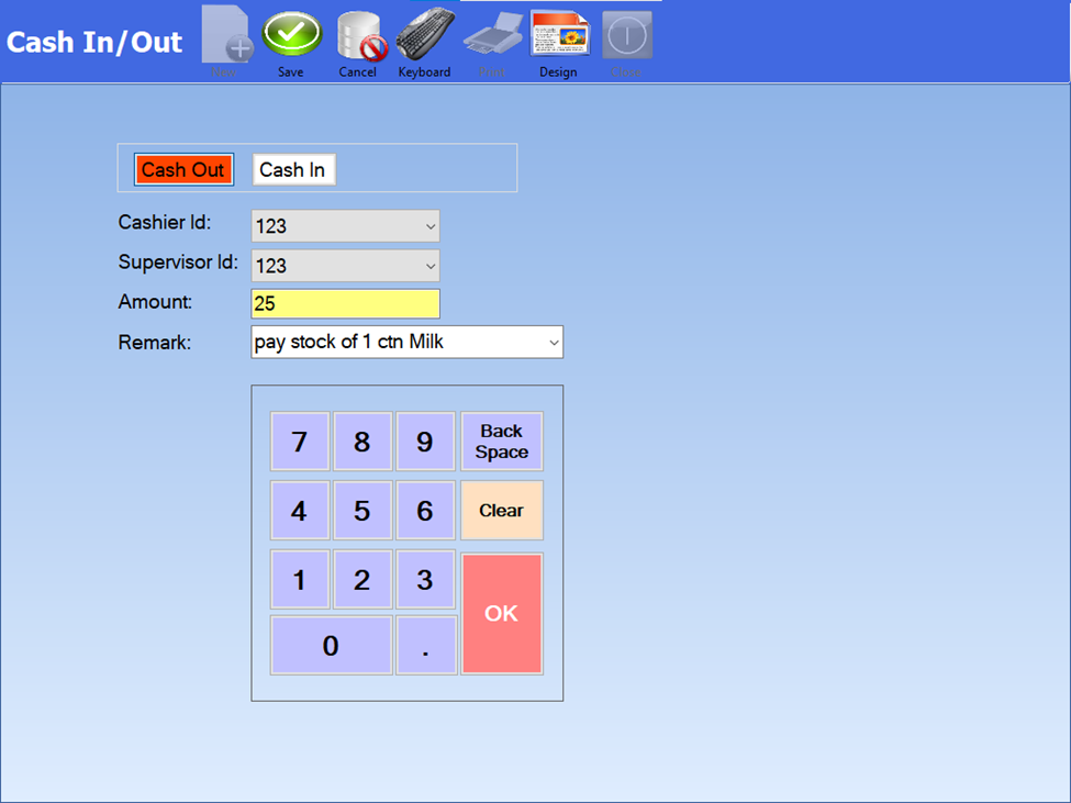 Click New button > Click Cash In or Cash Out button > insert Cashier ID > Insert Supervisor ID > Enter amount of money > put remark > Click Save button.