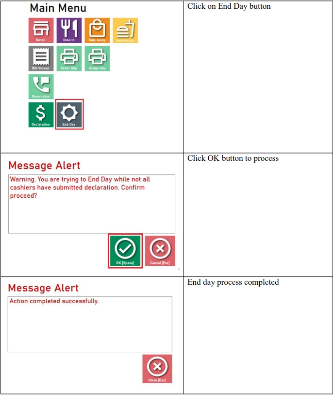 To perform Day End closing, users have to ensure that there are no pending transactions in the recall bills section and all the counter has perform all the End Shift Closing.