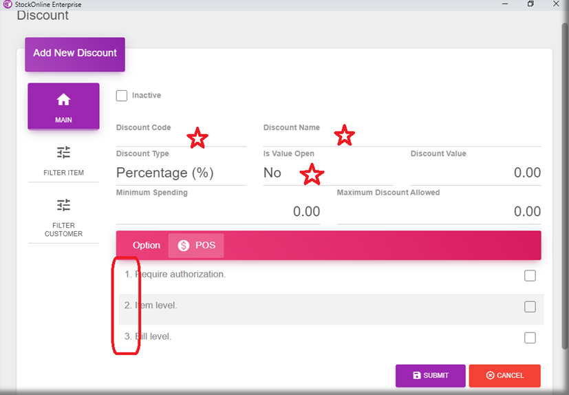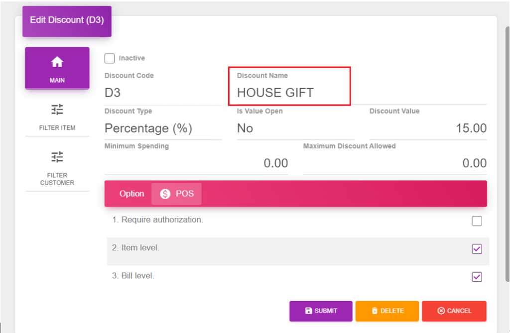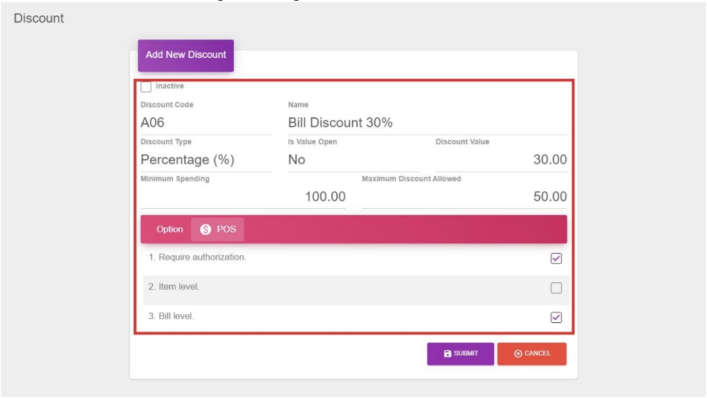 - Compulsory to fill in the Discount Code, Discount Name, Discount Type, Discount Value, and POS Options.