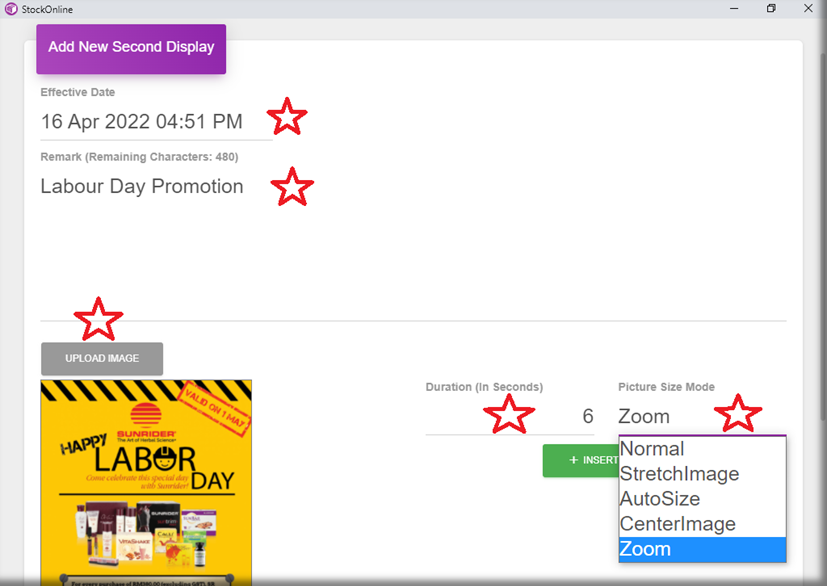 Guide: StockOnline Menu >> Front End >> Second Display >> + Add New >> Set Effective Date, remark >> Upload Image >> Set Duration, Picture Size Mode >> Submit.