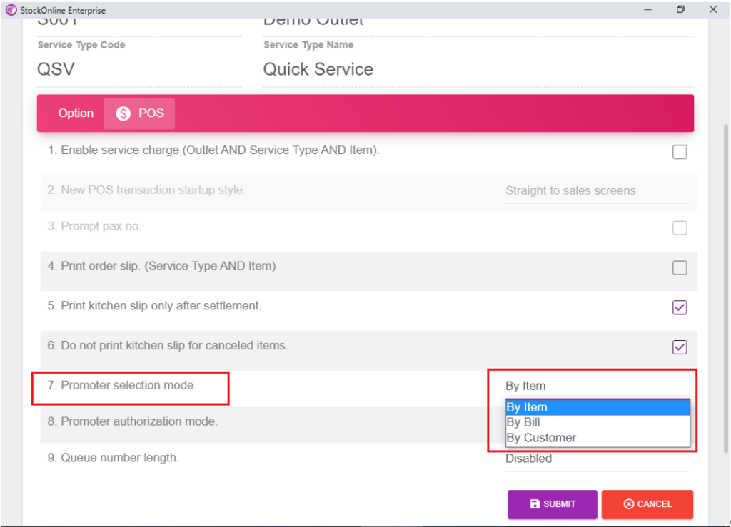 Next, scroll down and click no.7 Promoter Selection Mode >> Select mode either by Item, Bill, or Customer >> Submit. *Note. Don’t forget to edit the commission in each Item!