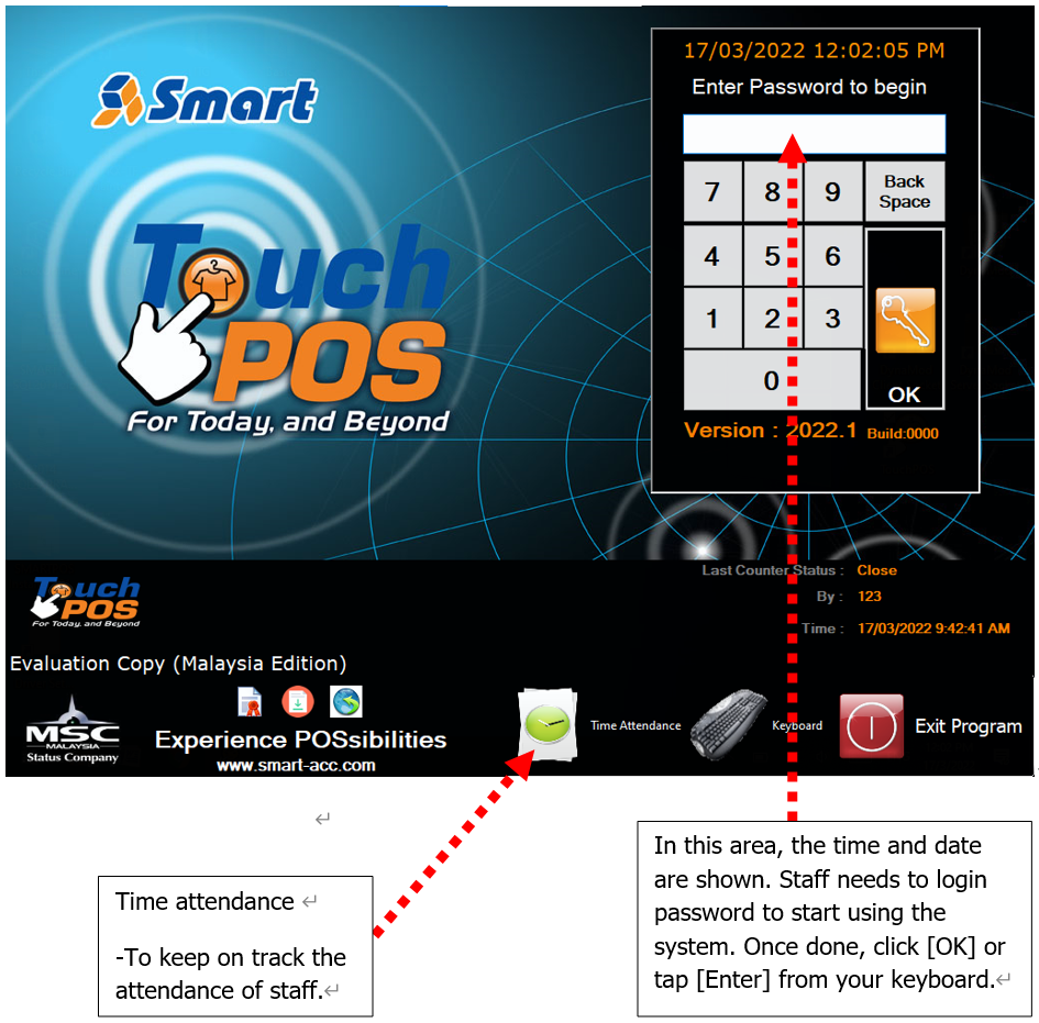 2. Click on the TouchPOS application to start. The first interface you will be seeing is as the below.