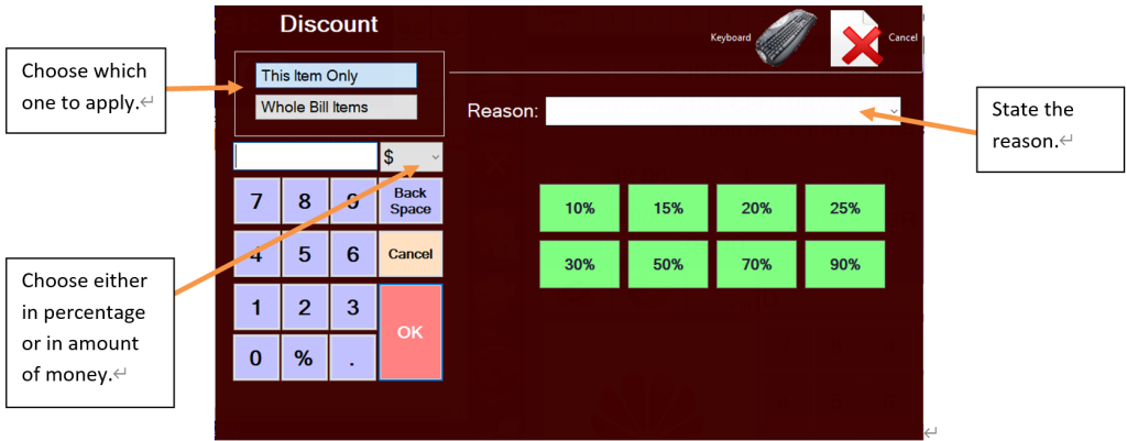 To apply discount, user can click on the discount button after choosing an item. In Discount page, user may choose either to give discount in percentage [%] or in money amount.