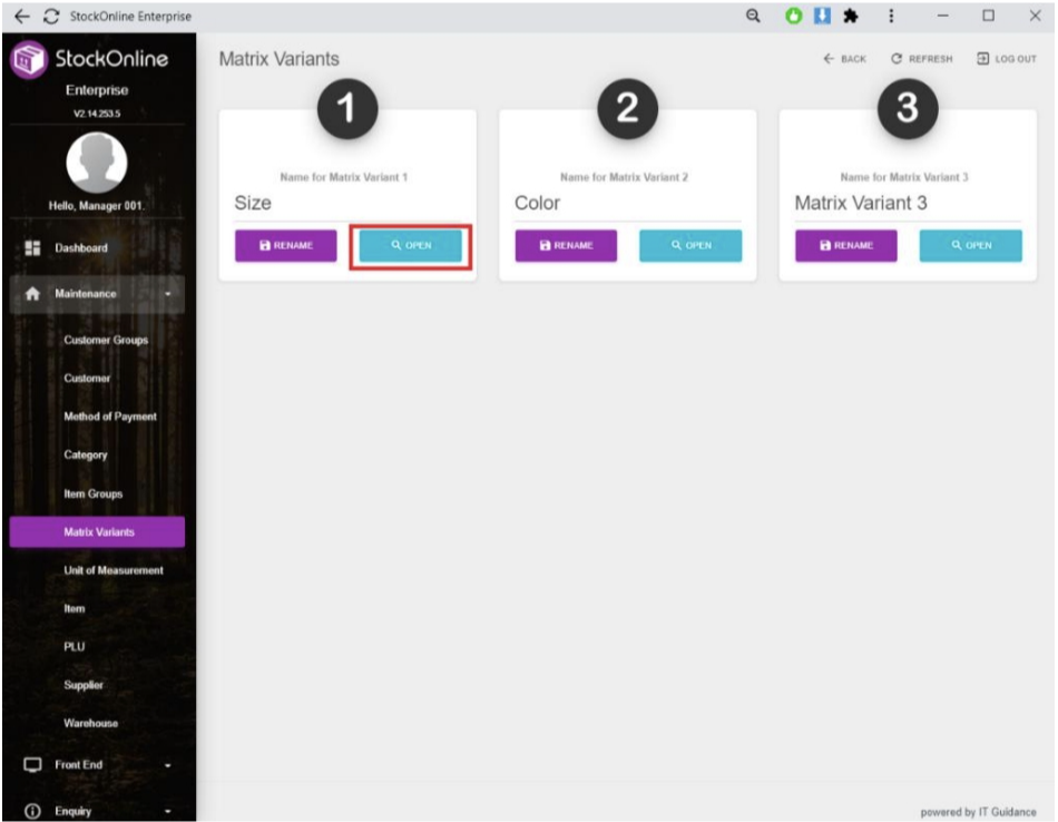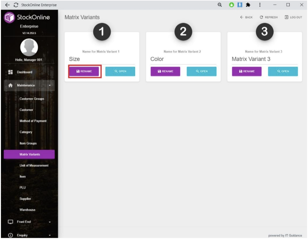 - Choose [Matrix Variants] under [Maintenance] > Click [OPEN] button