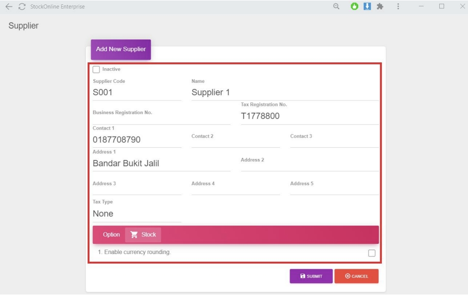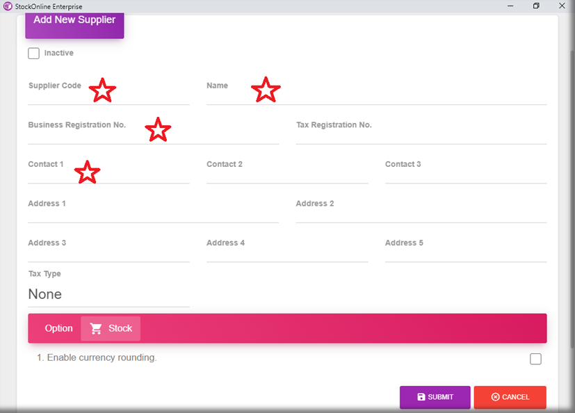 2. Enter relevant fields for New Supplier > Click [SUBMIT]