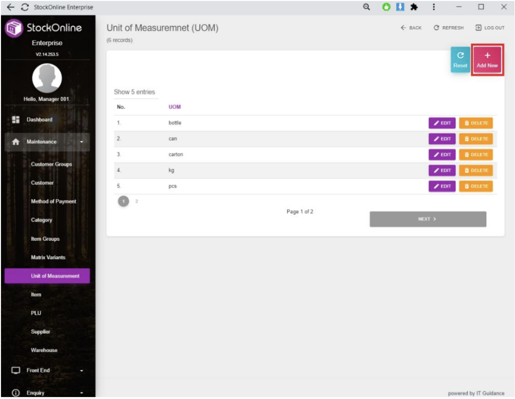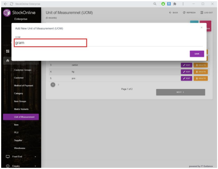 2. Enter new Unit of Measurement > Click [SAVE] button