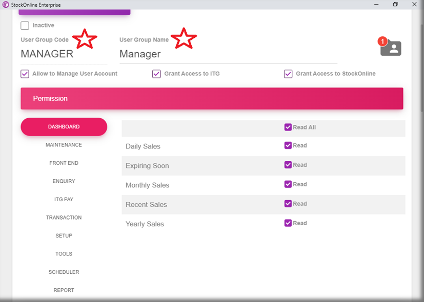 From StockOnline menu > Setup > User Group > Add New user Group