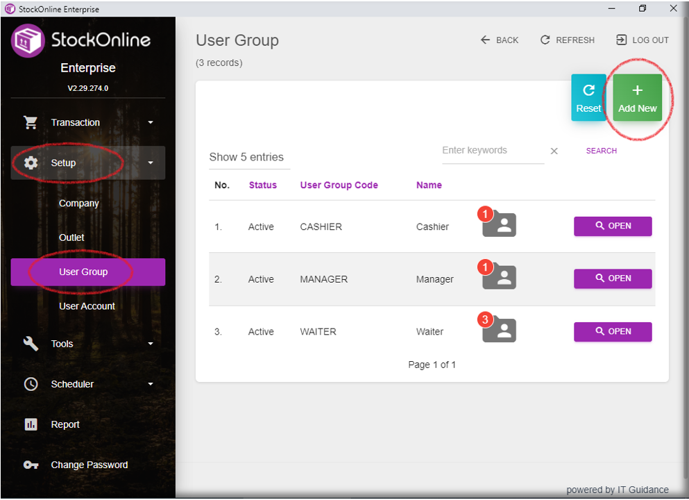 Guide: StockOnline Menu >> Setup >> User Group >> + Add New >> Set the User Group Code, User Group Name, Permission, Options on POS >> Submit.