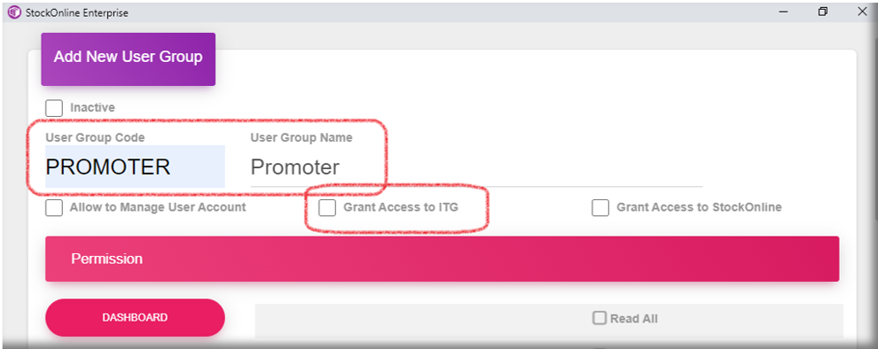 Fill in the User Group Code and User Group Name > tick Grant Access to ITG