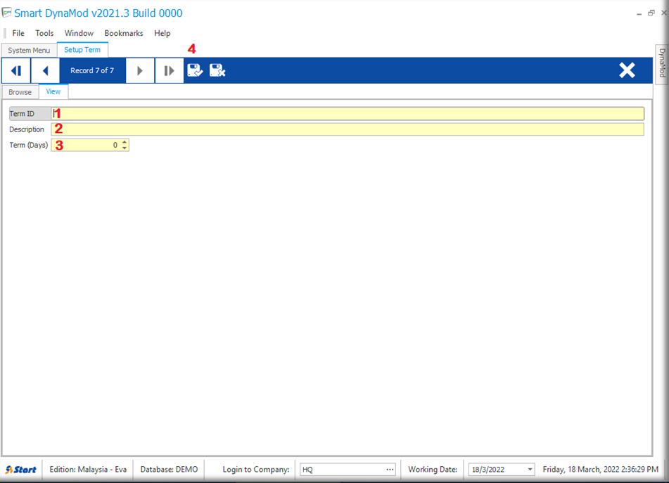 Click +> fill in Term ID, Description, Term(Days) > Save.