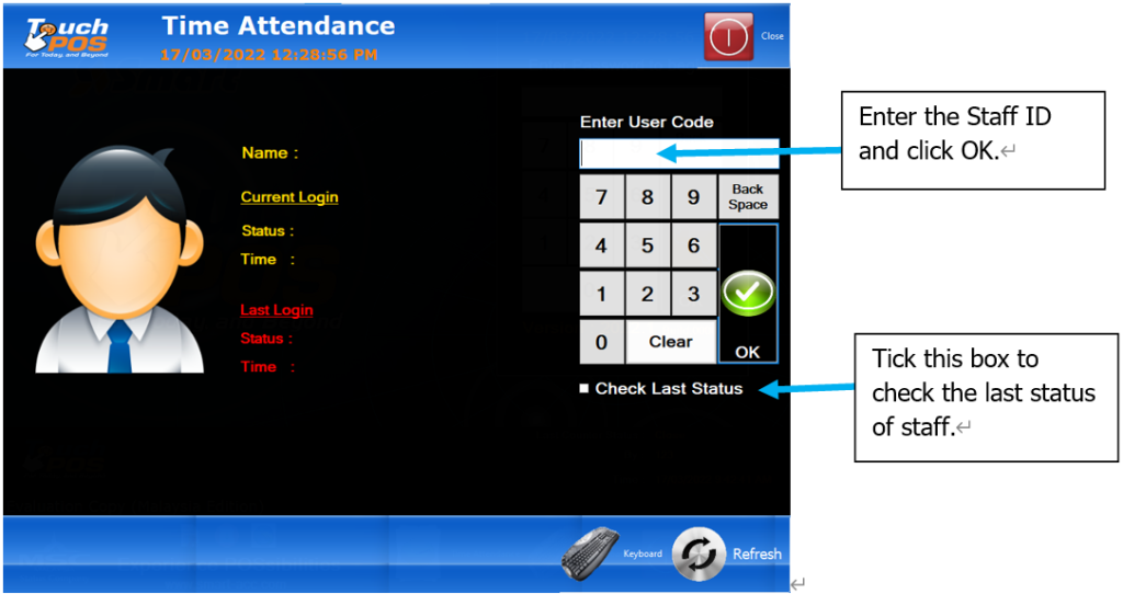 TouchPOS has Time Attendance function to keep on track the staff attendance on using the System.