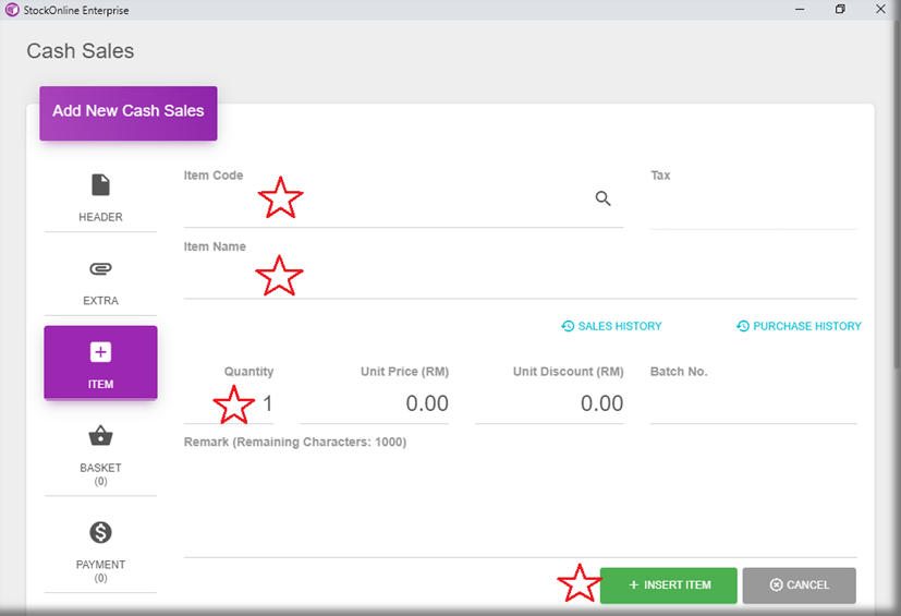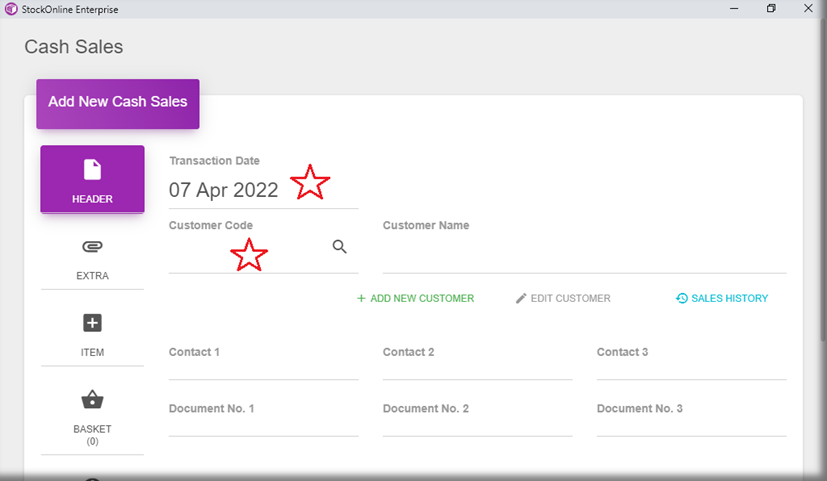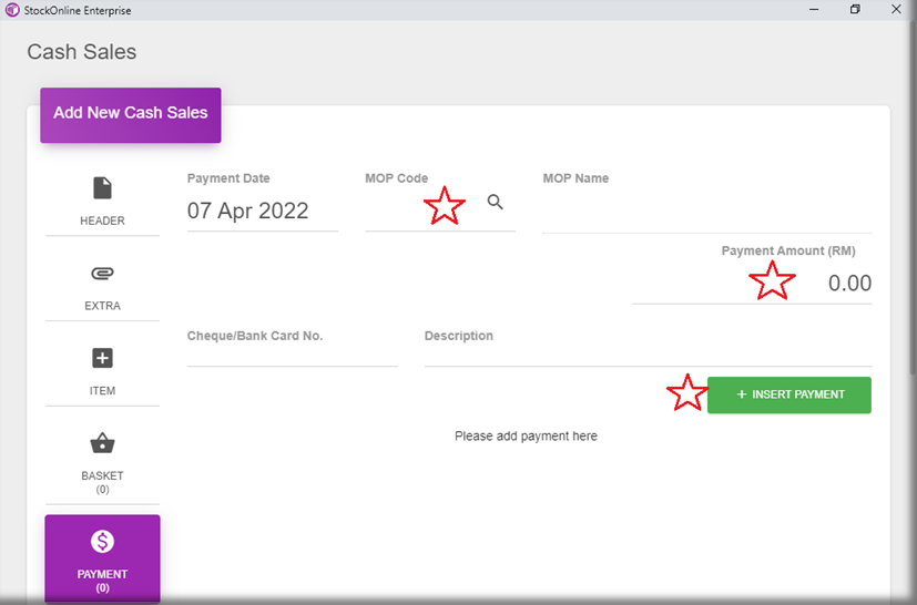 Guide: StockOnline Menu >> Transaction >> Cash Sales >> + Add New >> Header field, Set Transaction Date, Customer code and Name >> Item field, set Item Code, Item Name, QTY > insert item >> Payment Field, set MOP code and Name, Payment Amount > Insert Payment >> Save & Close.