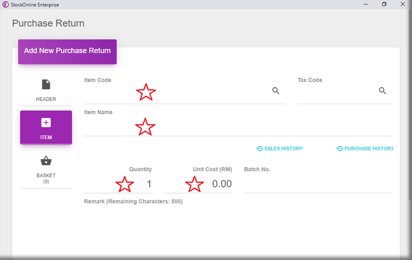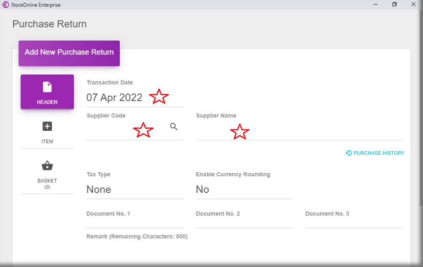 Guide: StockOnline Menu >> Transaction >> Purchase Return >> + Add New >> Header field, Choose the transaction Date, Supplier Code and Name >> Item field, Fill in the item Code and Name, Quantity, Unit Cost >> Save & Close.