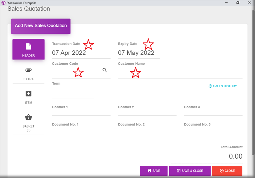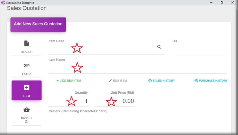 Guide: StockOnline Menu >> Transaction >> Sales Quotation >> + Add New >> Header field, Set the Transaction and Expiry Date, Customer code and Name >> Extra field, fill in Customer’s Address >> Item field, set item Code and Name, Quantity, Unit Price >> Save & Close.
